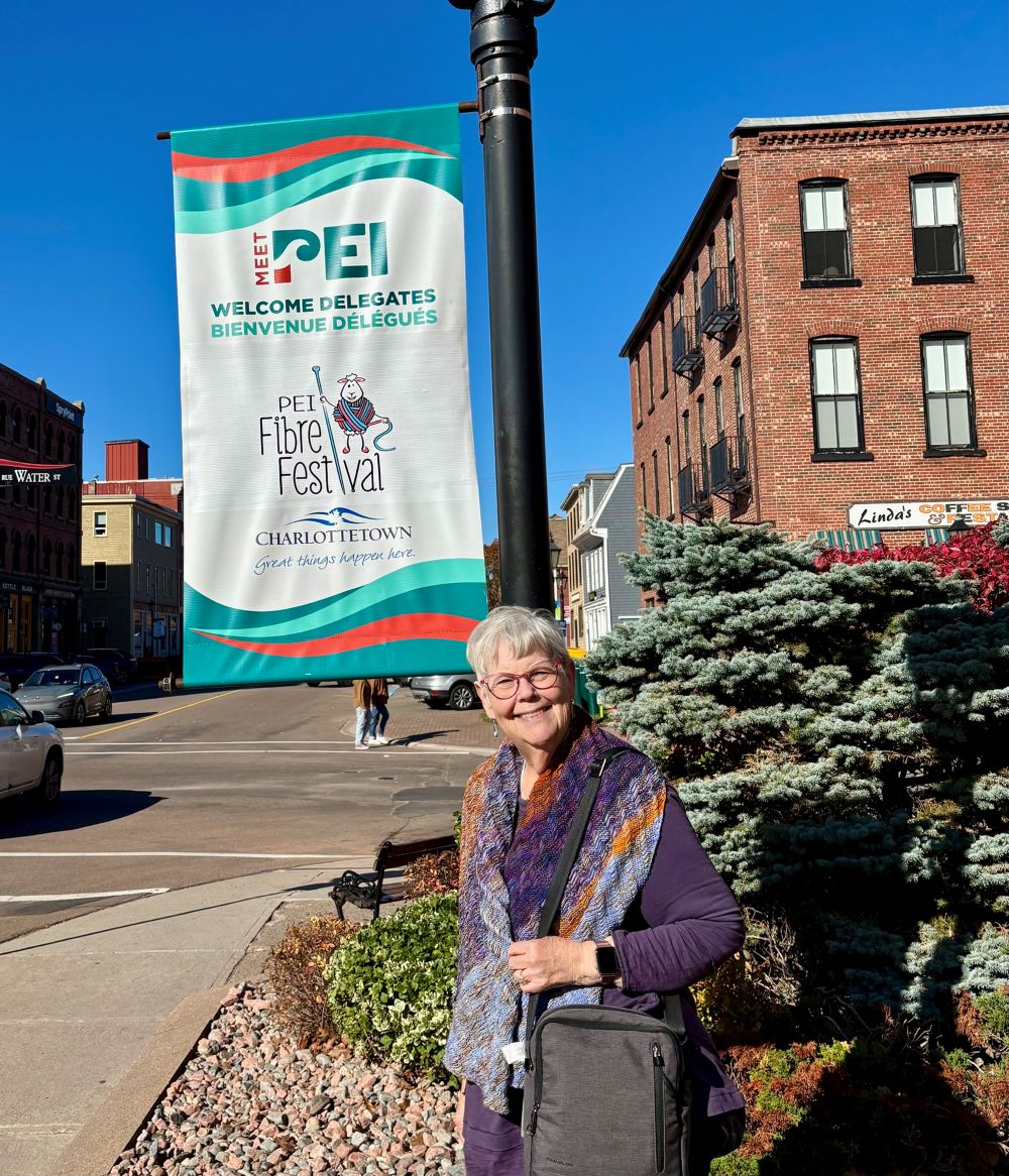 Carrie is enjoying the sunny, but chilly, day in Charlottetown by a banner advertising the Fibre Festival.